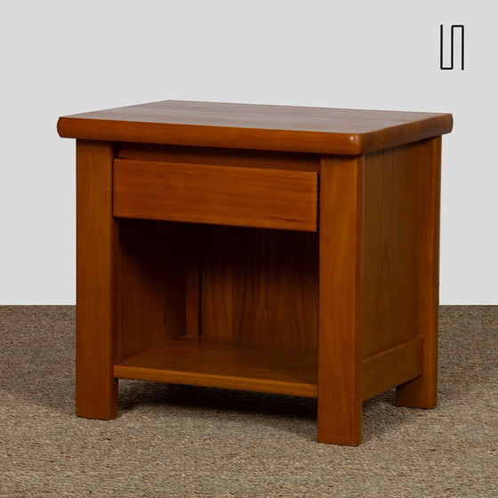 This vintage bedside table is in solid elm. It was made in France in the 1980s. It opens with a front drawer. This bedside table is in good original condition.