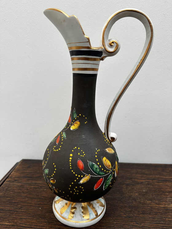 This vintage soliflore vase by Hubert Becquet Quaregnon is a striking piece of ceramic art. Its elegant black body is adorned with vibrant floral patterns in red, green, and yellow, highlighted with gold accents. The unique shape and intricate handle add a touch of sophistication, making it a perfect decorative item for any space. Despite minor chips, it remains a charming addition to a vintage collection.