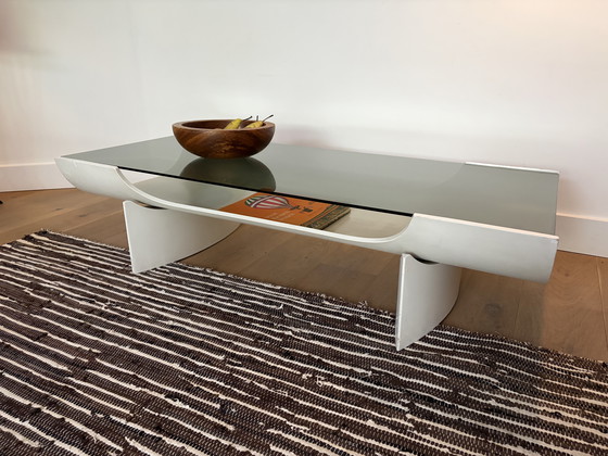 Discover this unique coffee table, a real eye-catcher in your living room! The elegant, curved white-coated wooden frame forms a beautiful contrast with the sturdy smoked glass top. This timeless beauty, likely from the 1970s, instantly adds a vintage touch to your interior. Furthermore, the top is removable. There is storage space underneath the top.
