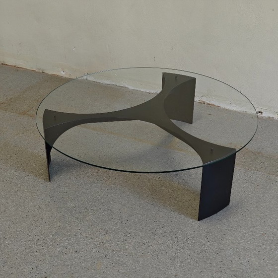 This special coffee table is still in good vintage condition. The glass has some scratches but is otherwise completely intact. The base was repainted at some point and still looks very neat. A true space age coffee table!