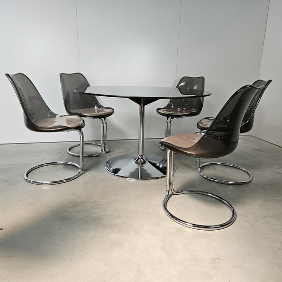 Vintage Space Age dining room set from the seventies. This set has been restored and is in top condition! Chrome is like new and the plastic tubs have been polished. Also, the foam in the seat has been renewed and upholstered in bronze vinyl. Minimal user marks present, including at the glass top.