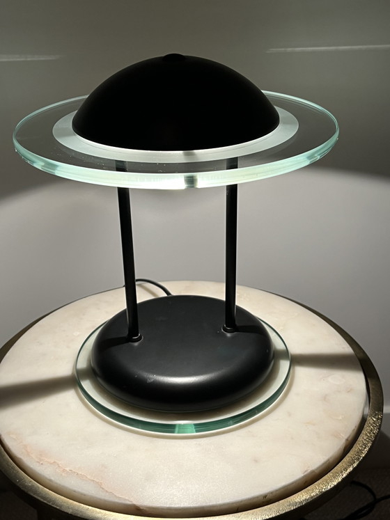 Illuminate your space with the captivating allure of the Vintage Space Age Herda UFO/Saturnurnus Table Lamp. This exquisite piece is a testament to the innovative design ethos of the Space Age era, combining futuristic aesthetics with functional elegance. Its unique UFO-inspired silhouette, crafted from high-quality metal and glass, adds a touch of cosmic charm to any room.