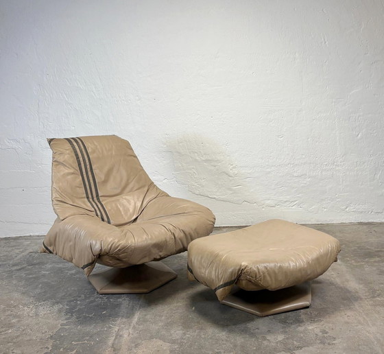 Vintage Space Age set of design swivel easy chair and matching ottoman voetstoel. Beige / light brown colour, by Dover design, Dutch design.