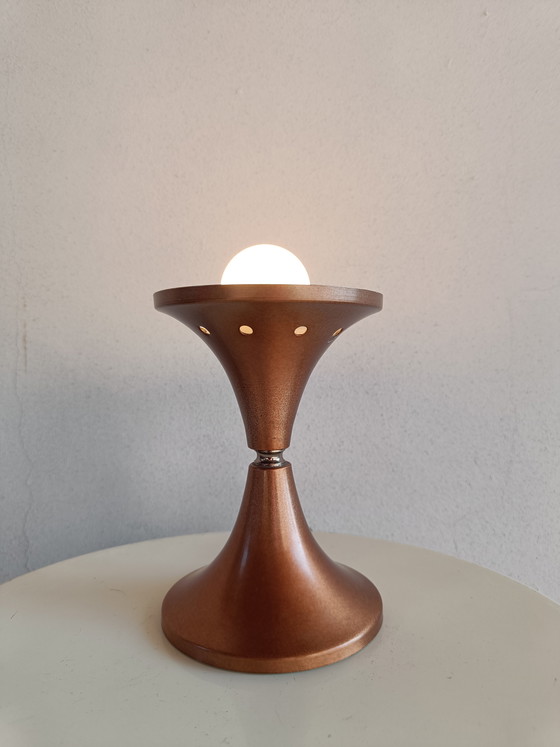 Vintage table lamp with a sculptural hourglass shape and warm burnished metal finish, typical of 1970s Space Age Italian design. The perforated upper cone creates a soft atmospheric light, enhanced by the visible globe bulb.