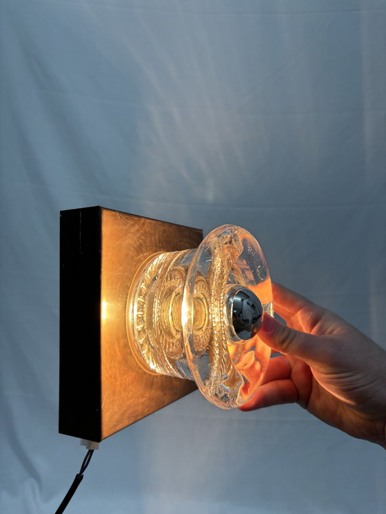The lamp features an impressive, thick glass shade in the signature "donut" shape. The pressed glass has a wavy texture that creates spectacular light and beautiful shadows on the wall or ceiling. A characteristic chrome mirrored dome gleams at the center of the lamp, completing the futuristic look.