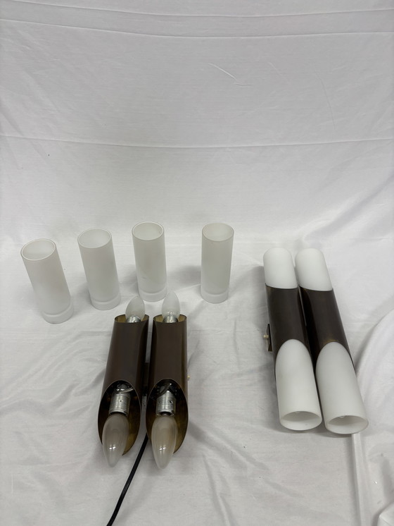 A beautiful set of iconic mid-century modern wall lamps, designed by Rolf Krüger for the renowned German manufacturer Paul Neuhaus Leuchten. These lamps from the 1960s/70s exude a unique space age aesthetic. Crafted from copper metal and featuring elegant white opaline glass diffusers.