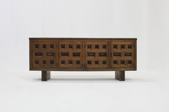 Brutalist wooden Spanish sideboard from the 1960s. Beautiful carved woodwork details. 4 paneled doors with geometric woodwork and plenty of storage space.