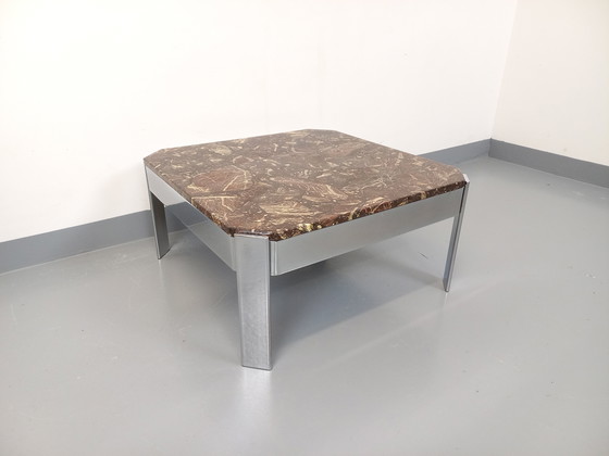 Vintage 70's square coffee table, octagonal top (square with beveled corners) in marble in garnet, black and ecru tones, chrome-plated metal base and structure. Very good overall condition with some signs of ageing, some surface scratches and micro-scratches on the top, patina and signs of ageing on the chrome.