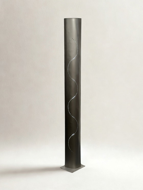 The steel column features a wavy line of perforations, creating a beautiful, rhythmic interplay of shadow and light.