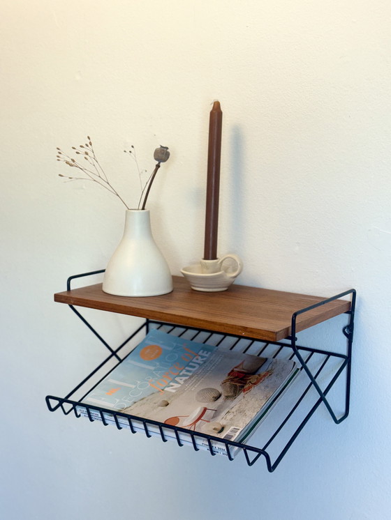 Stylish wall rack with wooden shelf and black metal frame. Features a handy magazine rack at the bottom and a sturdy wooden shelf at the top for books or decoration.