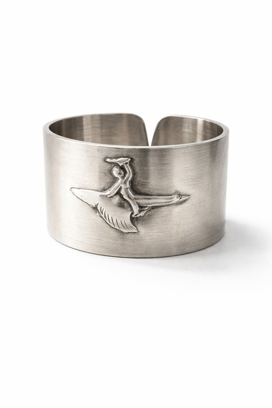 Refined vintage napkin ring produced by the historic Swedish brand GAB (Guldsmedsaktiebolaget), a leading name in Scandinavian silverware. The piece is decorated with a sculptural relief motif depicting a child riding a goose: a celebrated homage to Nils Holgersson, the unforgettable protagonist of Swedish literature and folklore. Note: This is a unique single piece, ideal as a place card holder, a refined desktop decoration, or a precious collector's item. This piece perfectly represents mid-century Scandinavian design, combining essential forms with a poetic and timeless narrative. The quality of the workmanship and the typical sheen of GAB alpaca make it a precious accessory, ideal for those who love a refined table rich in stories. Technical Details: Brand: GAB (Guldsmedsaktiebolaget), Sweden. Material: High-quality alpaca (silver-plated alloy). Hallmark: Present on the inner edge ("GAB ALP"). Subject: Nils Holgersson (from the novel by Selma Lagerlöf). Period: 1960s. Dimensions: Inner diameter: 4.3 cm Height: 2.8 cm Weight: 32 g Condition: In excellent vintage condition. The structure is solid and features a splendid natural patina. There are very slight signs of aging, attesting to its originality and authentic character. Ideal as: An original and cultured christening or birth gift, or as a classy detail to enrich a Nordic design collection or your daily table setting.