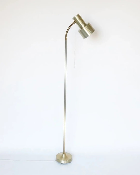 Stylish Swedish brass floor lamp with pull cord. Probably from the 1970s. The lampshade with diffuser can be changed in direction. Fits nicely in both vintage and modern interiors! The lamp has some signs of use.