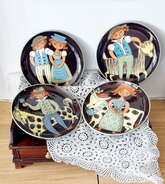 Vintage Swiss Arnold Zanher plate set of 4. Can be displayed on the wall or on a stand. Each plate is signed by an artist. Depict cute drawings of farmer girls and farmer boys with animals. Dark brown glazed background. Few plates have thin scratches (please see pictures). Otherwise, plates are in good vintage condition. Plates are approximately 22cm in diameter.