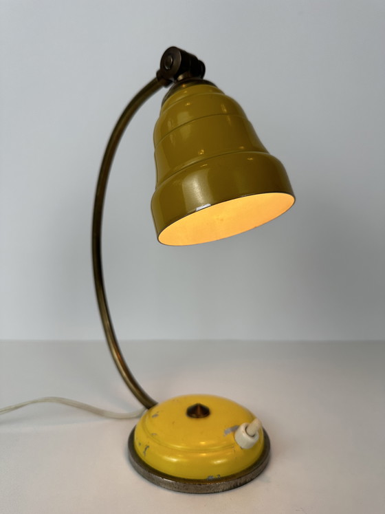 Rare Stilnovo table lamp. Completely original. Mustard yellow color. Brass details. Push switch in the base. Adjustable shade. E14 fitting. Marked. Collector's item. Height: 26cm. Width: 9cm. Depth: 19cm. Weight: 520g. In good condition considering its age. Photos form part of the description.