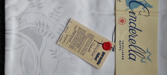 Tablecloth by the brand CINDERELLA with guarantee label, featuring a very elegant ivory shade, woven in damask, with a leaf pattern and very elegant.