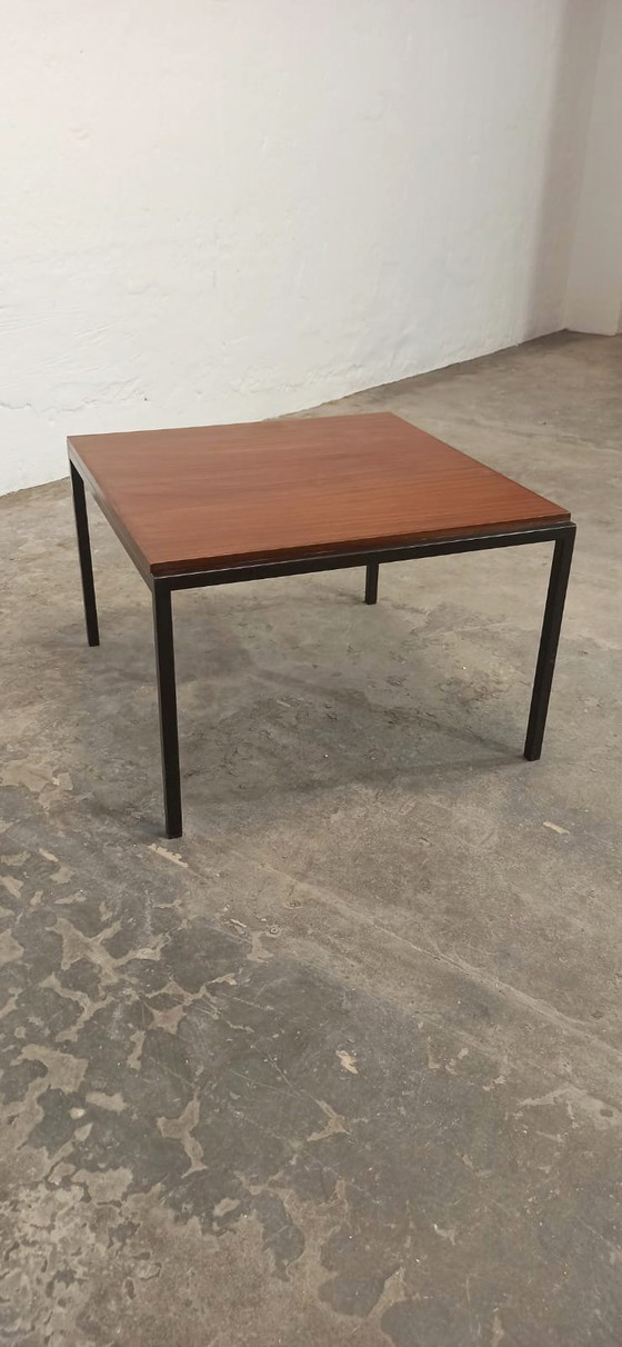 Vintage mid century coffee table, with black metal frame and teak top.