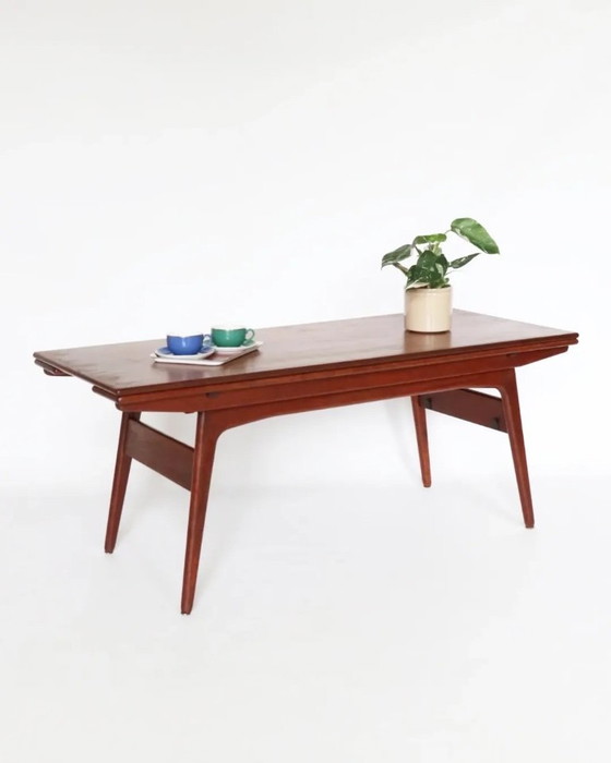 Beautiful teak coffee table that can be converted into a dining table from Danish manufacturer Trioh Möbler. The table can be raised and widened. The model is also known as the "Copenhagen" model. It was specifically designed for the new post-war small apartments of the 1950s and 1960s in Copenhagen. A space-saving piece of furniture was therefore the perfect solution. The table was possibly designed by Danish designer Kai Kristiansen.