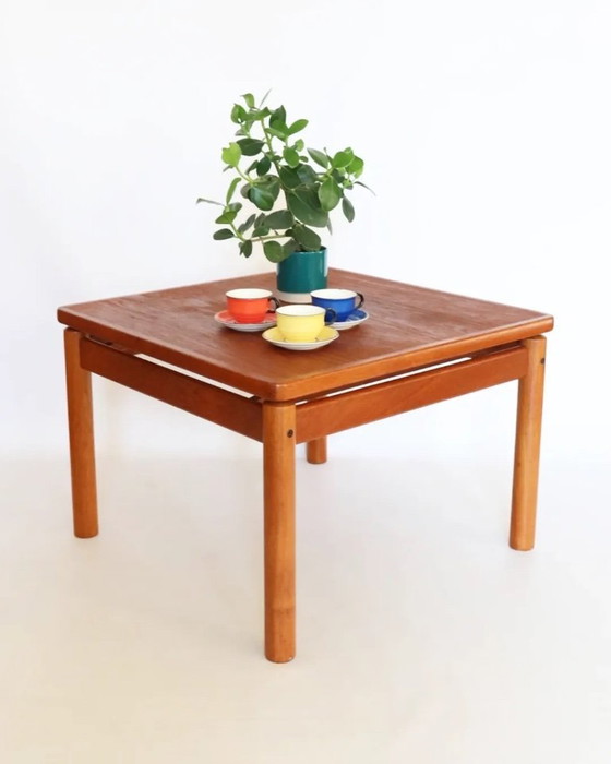 Beautiful square teak coffee table from Danish manufacturer Trioh. Practical, compact coffee table with rounded corners and solid teak elements. After we treated this table with oil, it's in near-new condition.