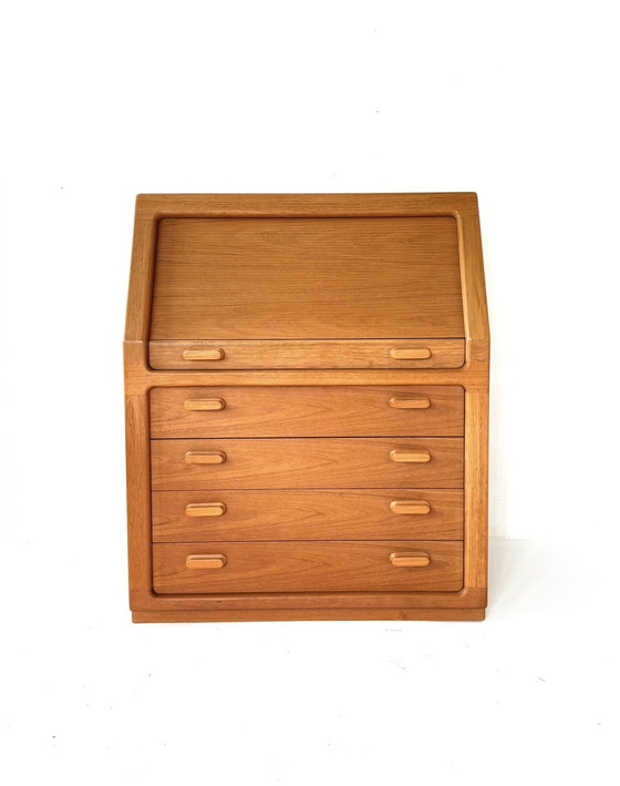 Beautiful and unique item. You don't come across this model very often. Solid and teak veneer secretaire with graceful rounded edges, beautiful wood joints and visible wood grain.