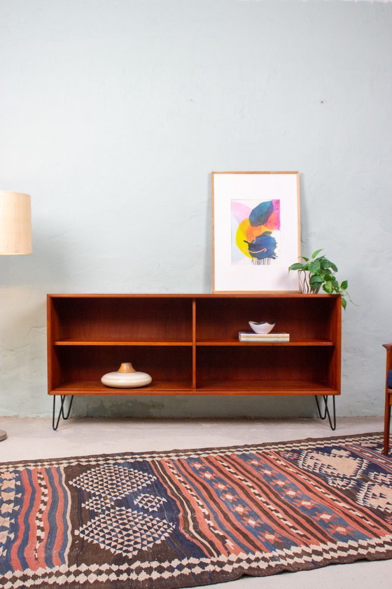This open teak sideboard, with its clean lines and warm wood tones, creates a calm and harmonious atmosphere in any room. The open design gives the piece a light and airy feel while offering ample storage for books, ceramics, or other items you like to display.