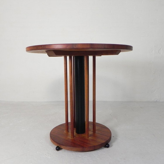 This teak table has a round top and a central leg, creating a simple yet elegant design.