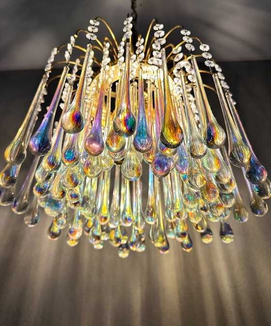 Beautiful, luxurious Italian chandelier. This 1970s lamp, with its iridescent glass teardrops, is truly a feast for the eyes. It features a beautiful gold-colored base and three central light sources. In good vintage condition!