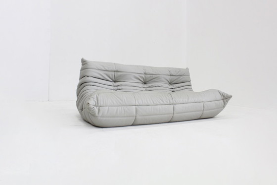 Vintage Togo sofa by Ligne Roset, designed by Michel Ducaroy. This original vintage Togo 3-seater sofa is upholstered in high-quality grey leather, produced in 2015. The leather is in good condition with light signs of wear consistent with its age.