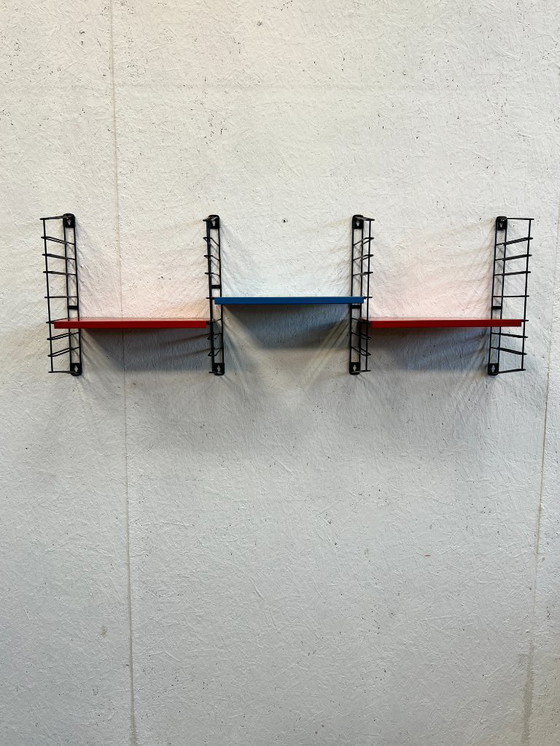 A very attractive and decorative wall unit. Made in the 1960s by the Dutch company Tomado. The unit is made of metal and consists of four black shelves and three wall shelves, two in red and one in blue. It can be arranged as desired and is very easy to assemble. Each piece is individually marked. In good condition with only minor signs of wear consistent with its age.