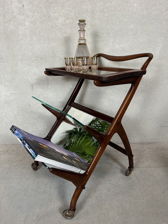 Stunning, elegant serving trolley model 65, designed by Ico Parisi for Angelo Baggis, Italy 1952. This serving trolley, also a magazine rack, is made of mahogany and finished with beautiful brass details. Equipped with two beautiful curved glass bowls (1 small chip at the front and 1 small chip at the back >>> see photos) and a removable tray with inlaid glass. The curved design and brass details are typical of the Italian design period. Beautiful condition. Height: 66cm. Width: 45cm. Depth: 50cm. Collector's item.