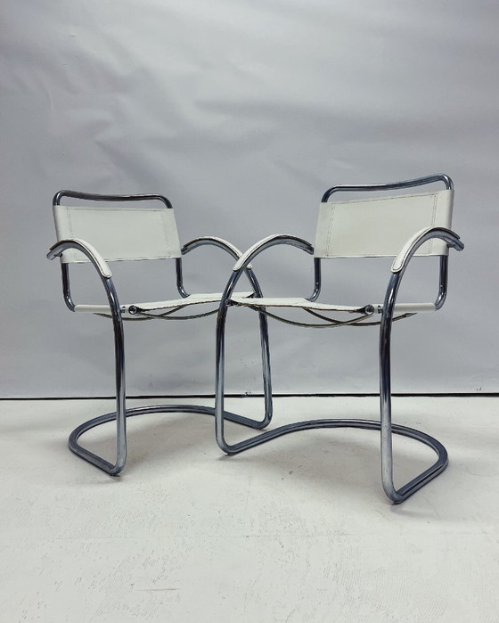Set of 2 vintage tubular frame chairs with a curved chrome-plated metal sled base and white skai (faux leather) upholstery. The chairs feature armrests and an open, curved construction.