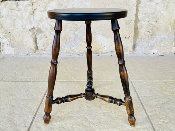 Vintage turned wood stool on tripod legs.