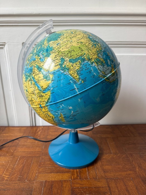 Mounted on a blue base, it stands out with its colors and distinctive style, becoming even more captivating when illuminated, with a soft light highlighting the map.