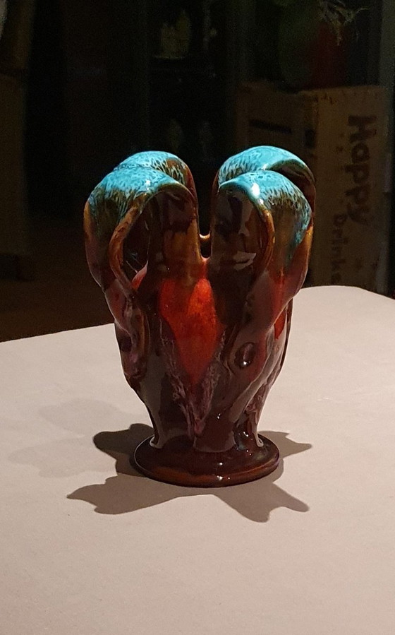 Handcrafted studio piece with an organic flower/flame shape and a characteristic lava/fat lava glaze in warm reddish-brown tones with turquoise accents.