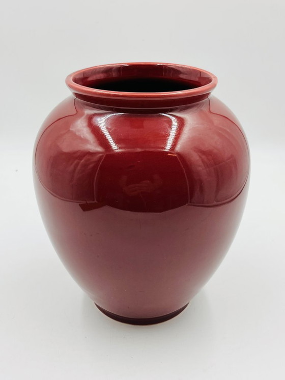 Elegant vintage glazed ceramic vase in a stunning deep burgundy hue with a glossy sheen.