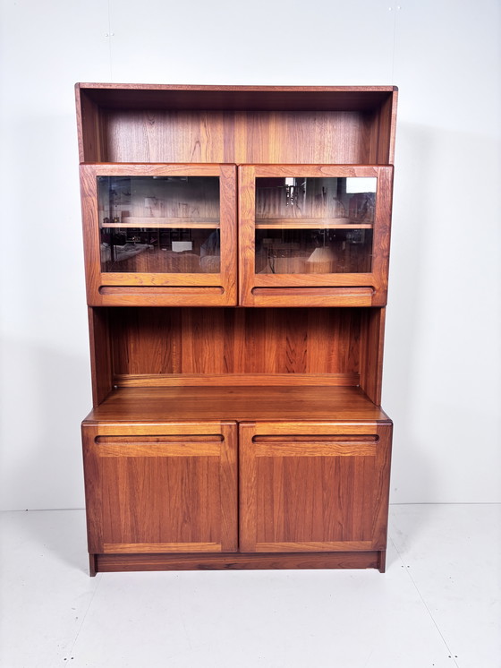 This exquisite vintage Danish display cabinet, crafted from rich teak wood, embodies the timeless elegance of Mid Century Modern design. Its warm brown hue and sleek lines make it a perfect addition to any sophisticated living space.