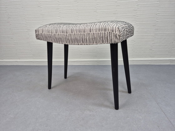 Kruk/hocker/ottoman met conische poten in zwart. Gestoffeerd met een ecru/zwarte stof. In goede vintage conditie.