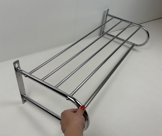 Wall coat rack, 1930s style, chic model in Art Deco style executed in chrome and equipped with a tube for hanging clothes hangers. On top a hat rack consisting of tubes.