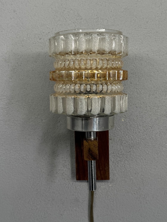 Charming vintage wall lamp with a characteristic glass shade in clear and amber. The glass has a beautiful texture that creates a warm, soft light on the wall. The combination with the wooden wall bracket and metal fixture gives the lamp a recognizable mid-century look.
