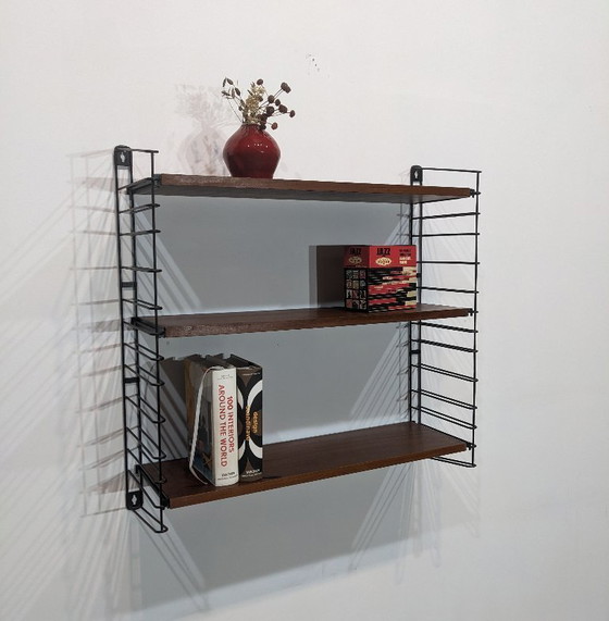 Vintage wall shelf. Tomado Holland, teak. Black metal uprights. W 70 / H 70 / D 24