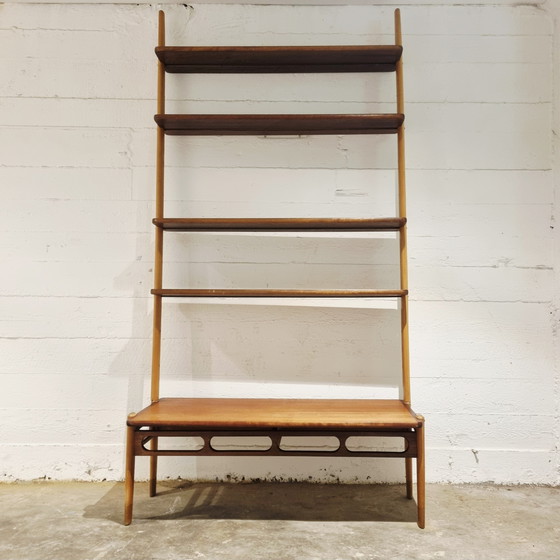 Beautiful two-tone wall unit by William Watting for Scanflex. A particularly fine combination of dark teak and light beech, with lovely rounded details and an open structure. The set is marked with a manufacturer's metal plate on the back. The cabinet is quite stable, with the shelf supported by a metal bracket secured to the wall. Only two small holes need to be drilled in the wall.