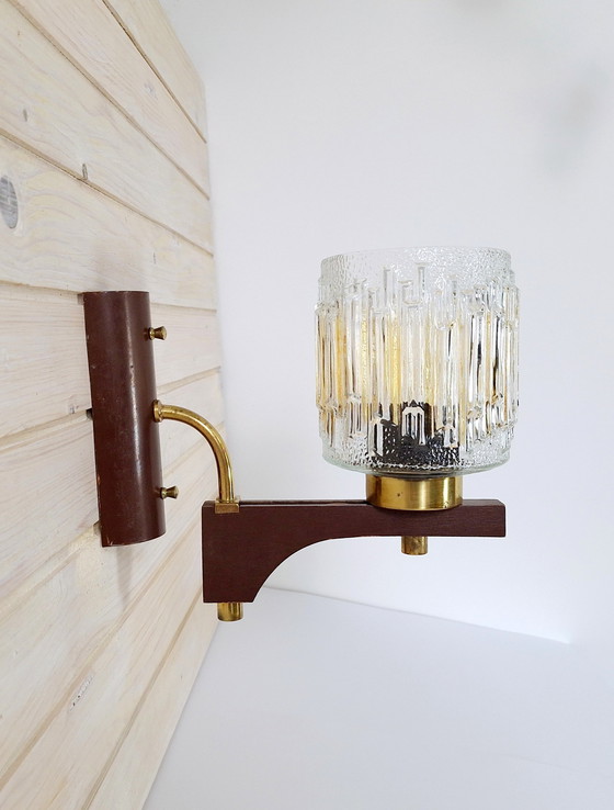 A beautiful wall lamp, manufactured in the 70s of the last century by the company Emi Poljčane. A combination of metal wall bracket, gold-plated aluminum and wood, with beautiful hand-blown clear patterned glass and added gold color.