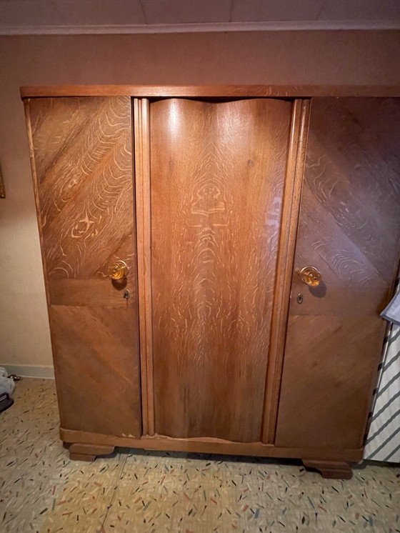 Vintage wooden cabinet. The middle door is made of wavy wood. Rounded corners. Only for hanging clothes. Some minor damage to the wood. Height 180 cm. Width 164 cm. Original handles.
