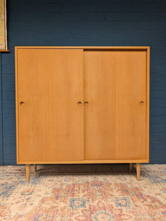 Very Beautiful Vintage Wardrobe or Shoe Cabinet. This cabinet was produced by Swedish manufacturer Karl Andersson & Söner, designed by Borge Mogensen. The cabinet is marked. The cabinet is spacious and offers a lot of storage space. Behind each sliding door there are up to five shelves that are height adjustable. Despite its age, the cabinet is in good condition. There are slight signs of use here and there. Dimensions: Width: 135 cm. Depth: 36 cm. Height: 139 cm.