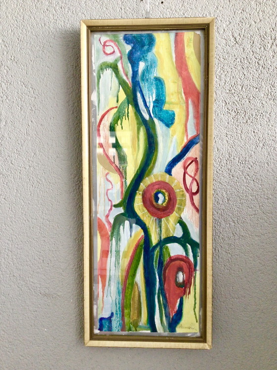 This captivating vintage artwork, potentially by Barbara Gaul and signed 'Annah,' is a striking addition to any art collection. The piece features a vibrant interplay of colors, including blue, green, red, and yellow, creating a dynamic abstract composition that draws the viewer in.