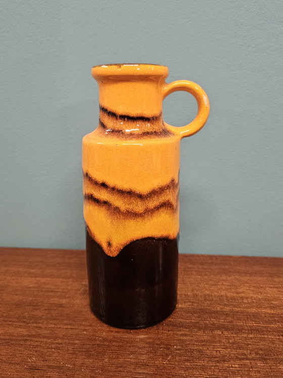 Beautiful vintage vase from West Germany, marked with number 407-20. This handle vase features a striking orange and black glaze, characteristic of the Fat Lava style from the 1960s and 70s. A unique decorative piece for any interior.