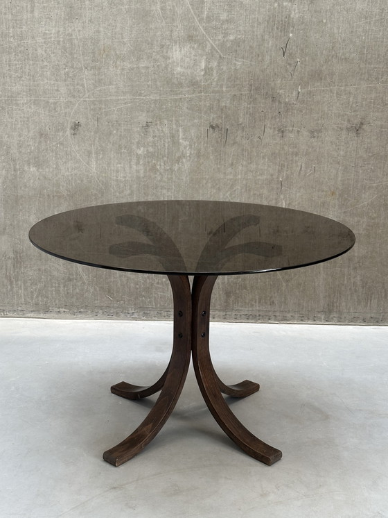 Beautiful vintage dining table in the Westnofa style. The table has a bentwood base and a smoked glass top, creating a true mid-century look.