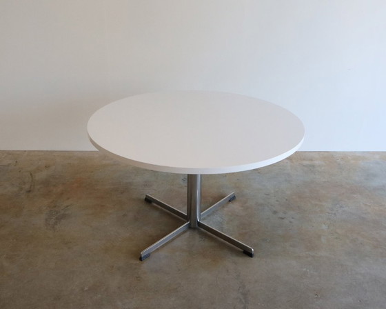 Beautiful dining table from the 1970s. This round white dining table features a beautiful chrome leg in Pastoe style. A lovely minimalist design. It fits perfectly in both vintage and modern interiors. Considering its age, it is in beautiful vintage condition.