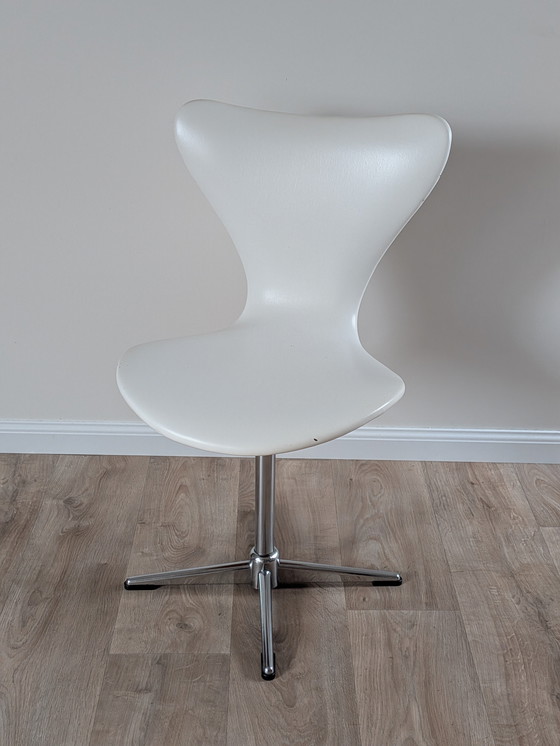 Vintage white skai leather swivel chair in the style of Arne Jacobsen’s Danish mid-century designs. The organic, sculptural seat shape is reminiscent of Jacobsen’s Series 7 / Ant silhouettes, giving it that clean Scandinavian modern aesthetic.