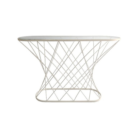 The playful twisted geometric pattern created by this console table gives a beautiful lattice effect. A white powder-coated metal oval serves as the base for numerous metal posts, crossing on the diagonals and leading to an oval-shaped clear glass top. A stunning organic pattern, this table is reminiscent of Isamu Noguchi's famous cyclone table, or the bottom half of the iconic Eames Eiffel chair.