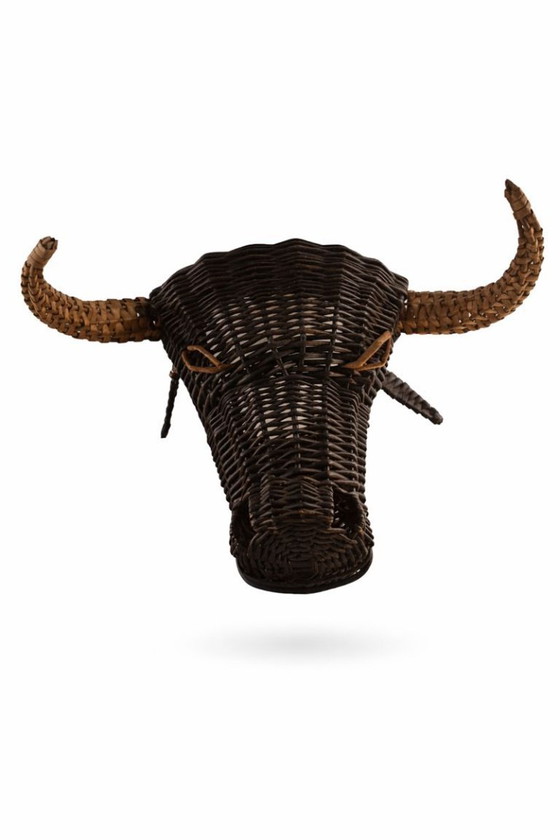 Embrace the rustic charm and sculptural elegance of this vintage wicker bull's head, a rare piece of French Provincial wall art from the 1950s. Handcrafted with precision in the South of France, this striking black toro head is woven from rattan, offering both strength and a natural texture that enhances any interior space.